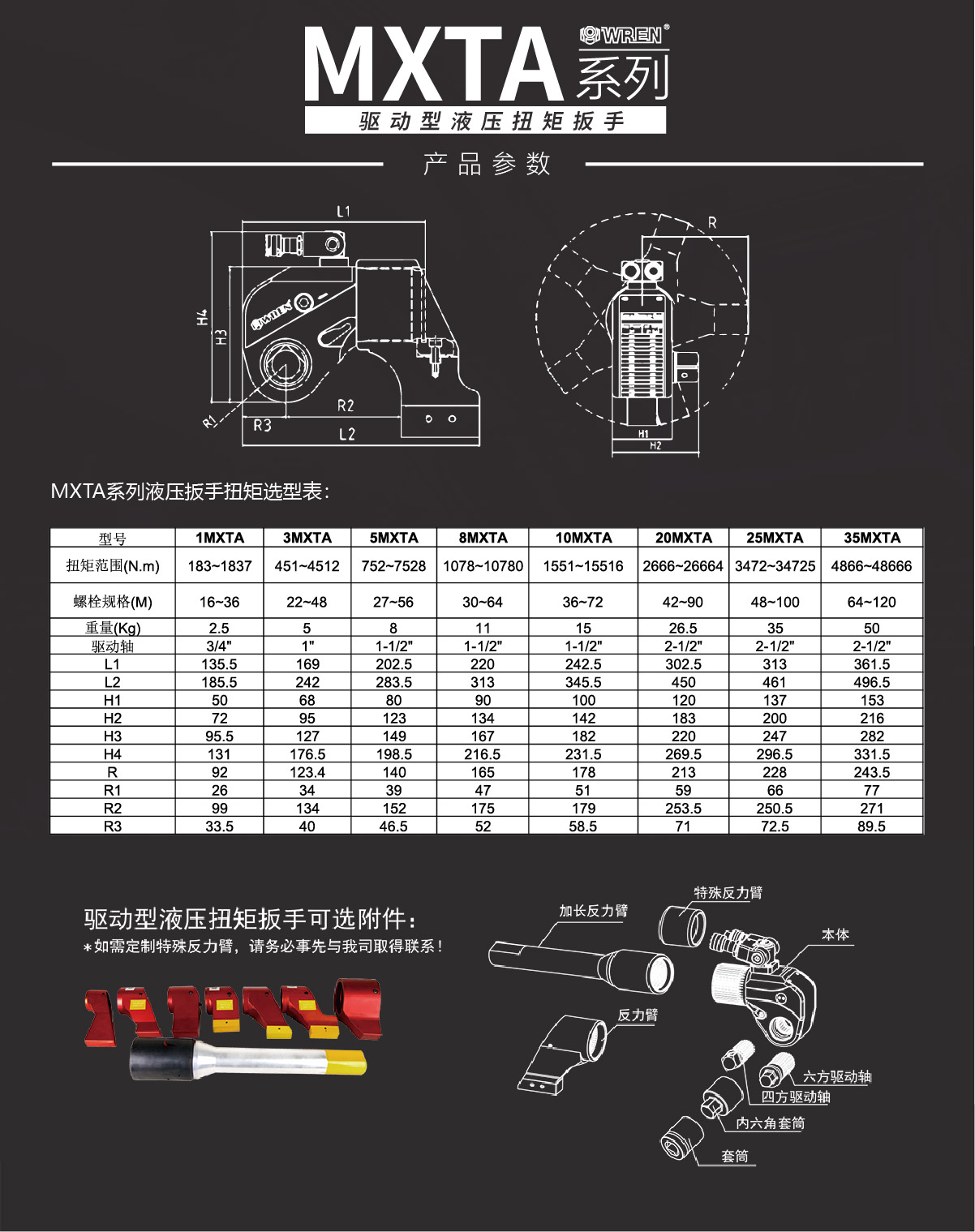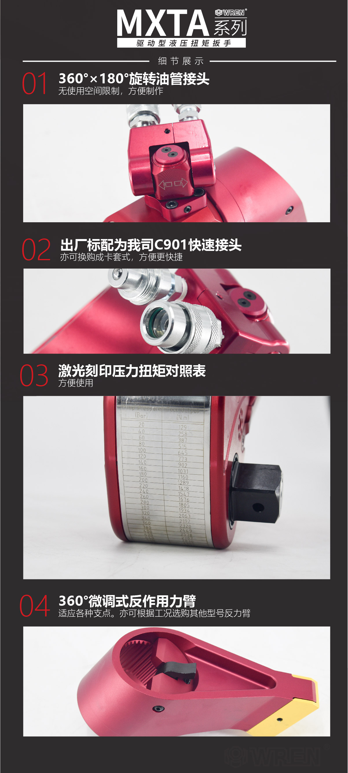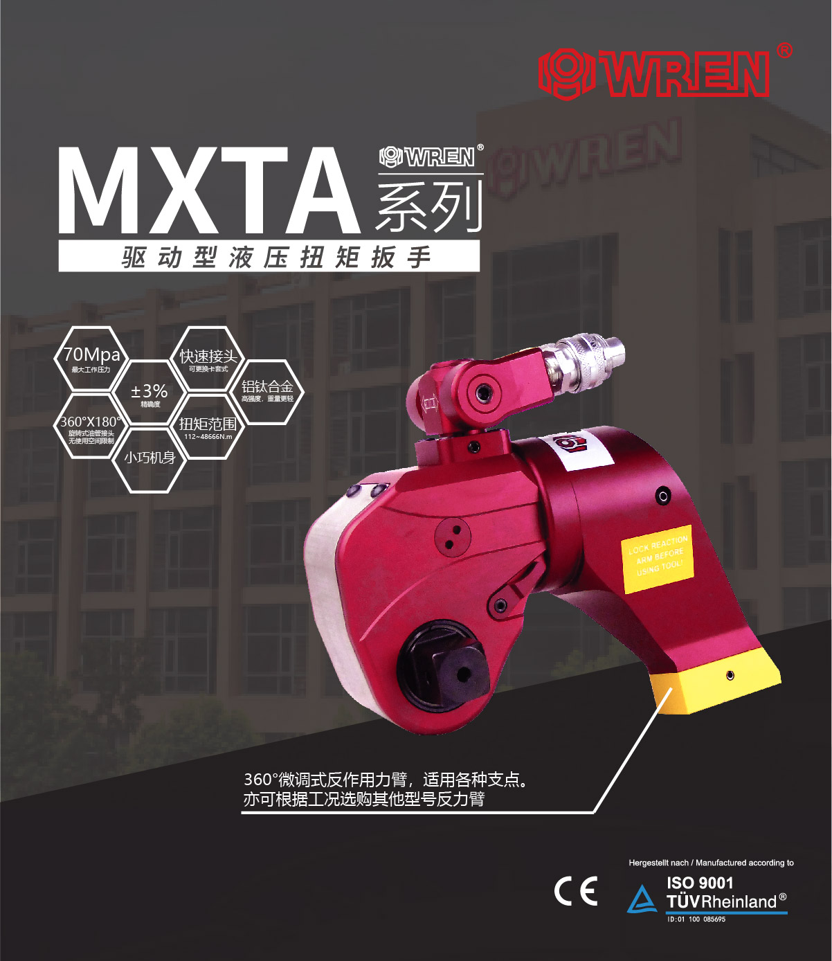 MXTA系列是WREN公司主力投放國內(nèi)市場(chǎng)的一款專業(yè)級(jí)別的液壓扭矩扳手。其鋁鈦合金的航空材料的液壓扭矩扳手重量輕,強(qiáng)度高,值得注意的是MXTA系列液壓扭矩扳手擁有從112N.m-48666N.m共8個(gè)標(biāo)準(zhǔn)型號(hào),可以出色完成螺栓的鎖緊以及拆卸工作。WREN品牌提供全球售后服務(wù),擁有完整的配套供應(yīng)能力,通過德國萊茵TUV認(rèn)證及歐盟CE認(rèn)證。